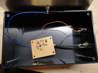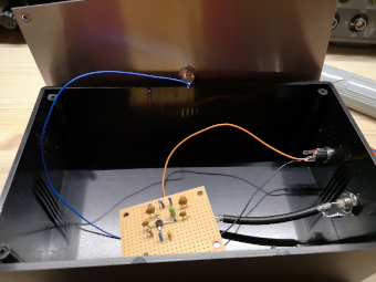 Alle Bauteile waren in meinem Bastelvorrat zu finden und so lötete ich die Schaltung auf einem Stück Lochrasterplatine zusammen. Eingepackt in einem standfesten Gehäuse macht die Antenne schon was her. Ich konnte damit innerhalb der Wohnung Stationen aus Europa auf 160m, 80m und 40m empfangen. Andere Bänder habe ich bisher nicht getestet, laut der Schaltungsbeschreibung soll diese aber bis 200 MHz funktionieren.
