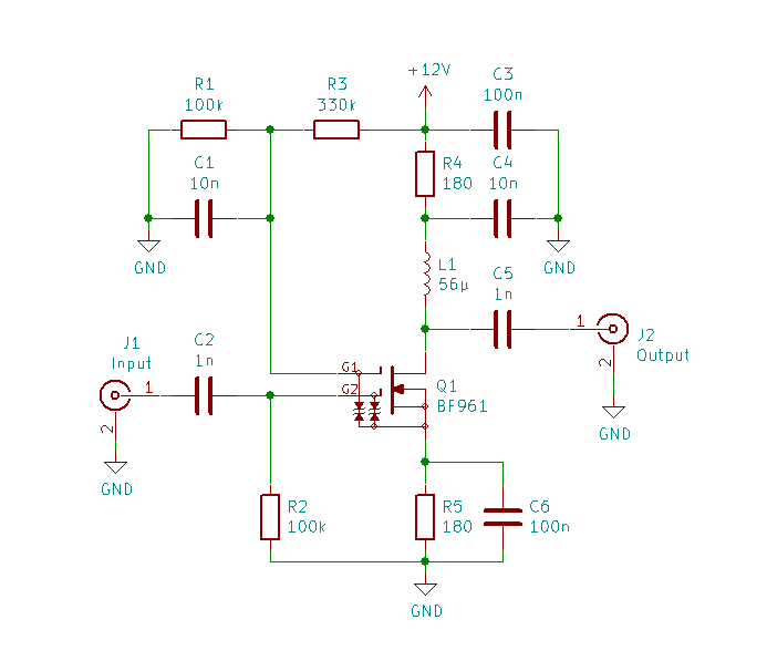 Bei ebay bestellte ich mir eine 120cm lange Teleskopantenne mit einem F-Stecker Anschluss. Im Buch “Hochfrequenz-Transistorpraxis” von Frank Sichla fand ich auf Seite 213 die passende Verstärker Schaltung. Den Schaltplan habe ich 1:1 aus dem Buch mit KiCAD “abgemalt”.